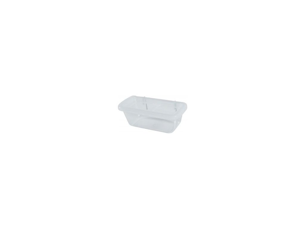 Transparentní krmítko s dělící mřížkou na zavěšení do klece pro ptáky.