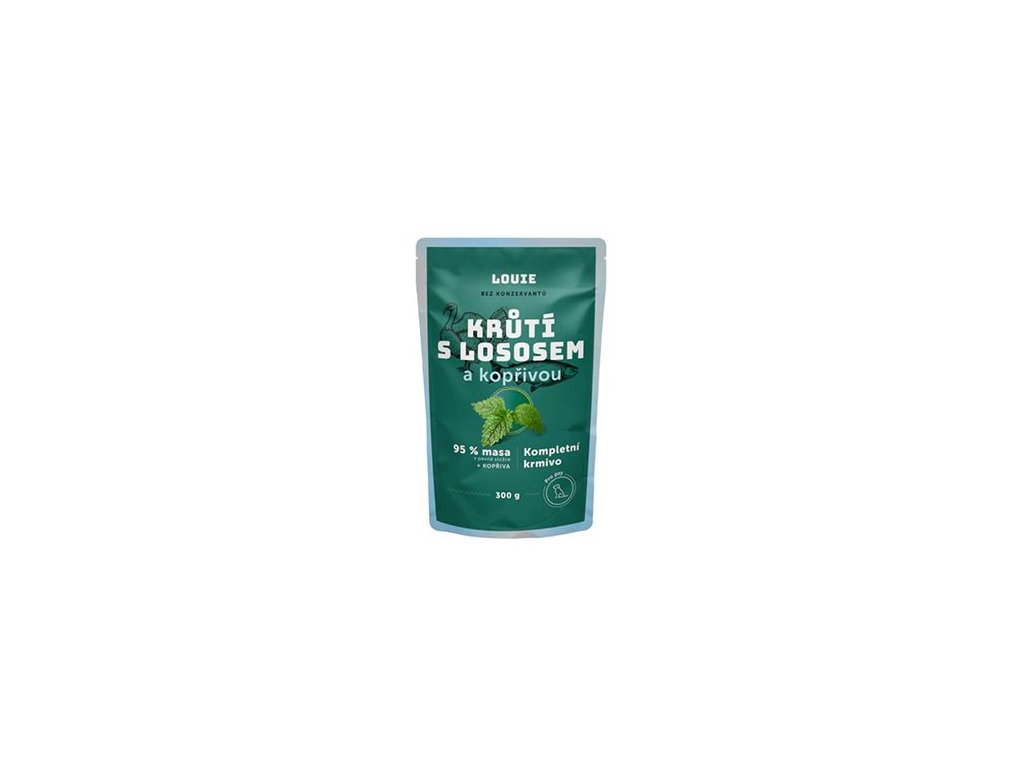 Kompletní krmivo bez obilnin pro psy každého věku i plemene, krůtí s lososem a kopřivou. Nabízí Vašemu miláčkovi možnost stravy z kvalitního masa (95 % v pevné složce). Pro podporu peristaltiky střev a simulaci minoritní rostlinné složky v potravě psů slouží příměs kopřiv. Krmivo neobsahuje žádné konzervanty, dochucovadla ani barviva, pouze 95 % masa, kopřivy, vitamíny a minerály.