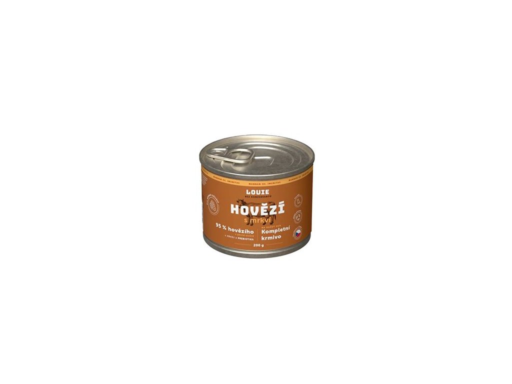 Šťavnaté konzervy obsahují 95 % mletého hovězího masa v pevné složce a 5 % rostlinné složky, vitamínů a minerálů. Obsažená mrkev navíc dodává psům potřebné živiny a minerály. A po Louie zbyde jen vylízaná miska.