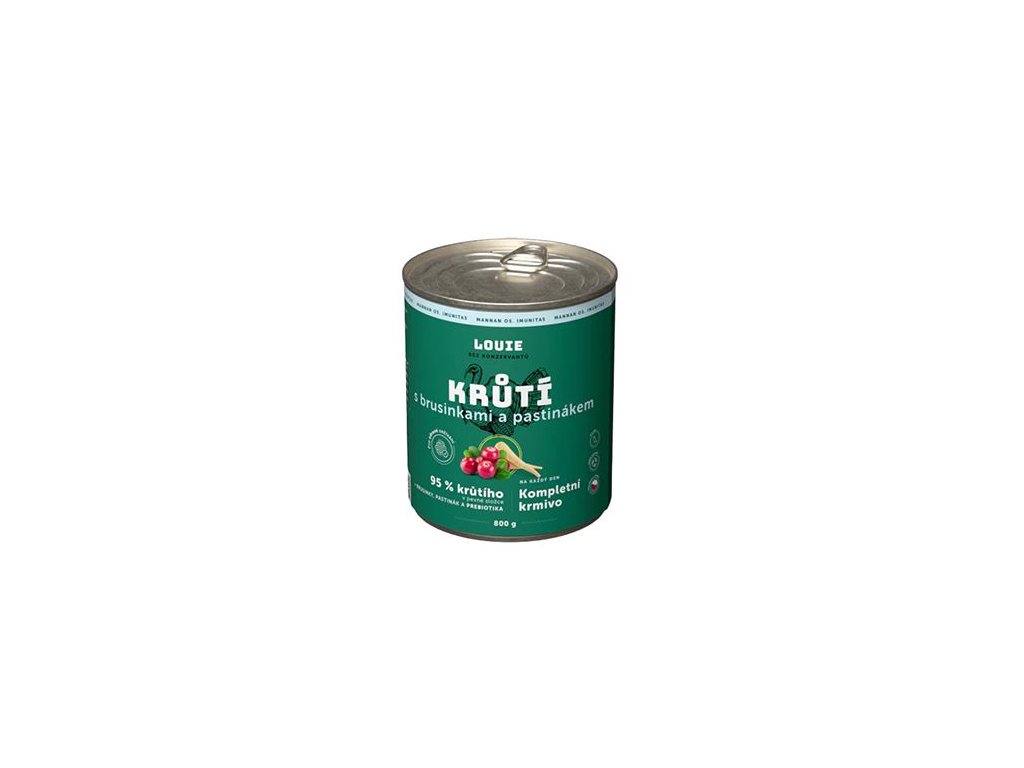 Kompletní krmivo bez obilnin pro psy každého věku i plemene, krůtí s brusinkami a pastinákem. Nabízí Vašemu miláčkovi možnost stravy z kvalitního masa (95 % v pevné složce). Pro podporu peristaltiky střev a simulaci minoritní rostlinné složky v potravě psů slouží příměs brusinek, pastináku.