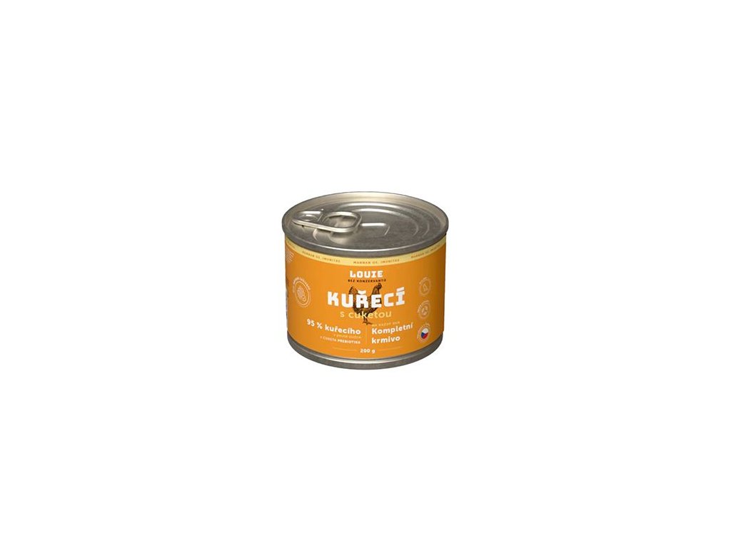 Kompletní krmivo bez obilnin pro psy každého věku i plemene, kuřecí s cuketou. Nabízí Vašemu miláčkovi možnost stravy z kvalitního masa (95 % v pevné složce). Pro podporu peristaltiky střev a simulaci minoritní rostlinné složky v potravě psů slouží příměs cukety. Krmivo neobsahuje žádné konzervanty, dochucovadla, barviva, pouze 95 % masa, 5 % cukety, vitamínů a minerálů.