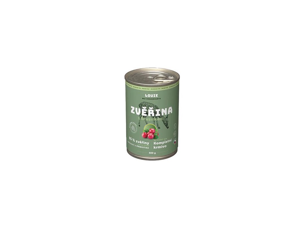 Kompletní krmivo bez obilnin pro psy každého věku i plemene, zvěřina s brusinkami. Nabízí Vašemu miláčkovi možnost stravy z kvalitního masa (95 % v pevné složce). Pro podporu peristaltiky střev a simulaci minoritní rostlinné složky v potravě psů slouží příměs brusinek. Krmivo neobsahuje žádné konzervanty, dochucovadla ani barviva, pouze 95 % masa, brusinky, vitamíny a minerály.
